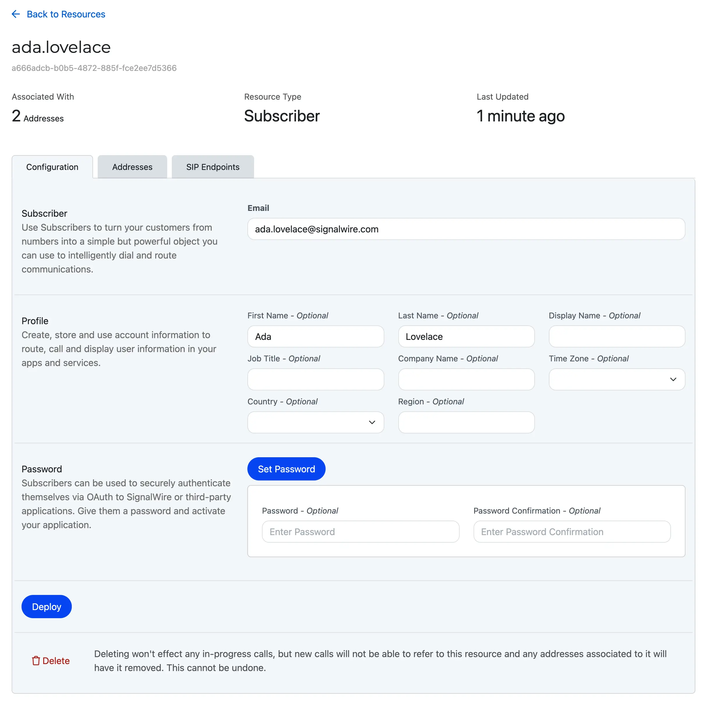 Once you have created a Resource, you can use the address to interact with it within the Call Fabric ecosystem. Additionally, you can view the created resource in the Resources tab of the SignalWire Dashboard. Here, you can view the address, type, and other details of the resource.