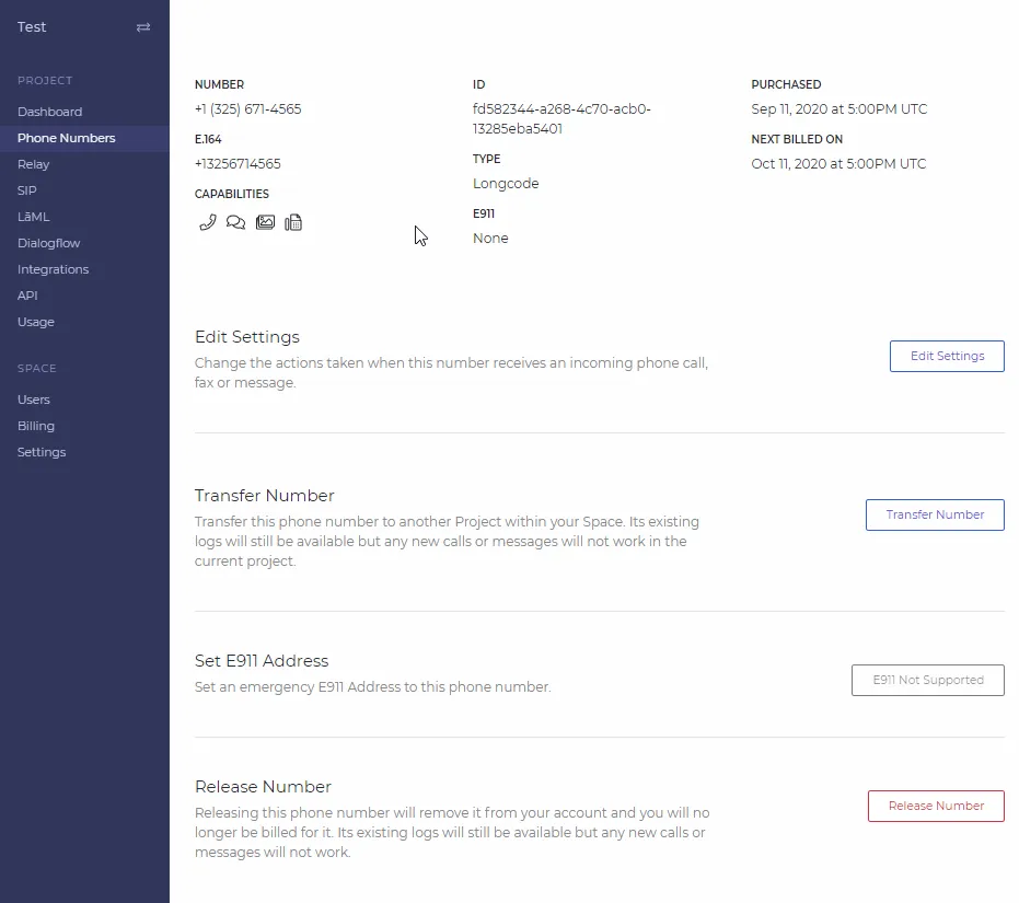 A screenshot of the Phone Numbers tab. A number has been selected, and the number details are visible. There are options to Edit Settings, Transfer Number, Set E911 Address, and Release Number.